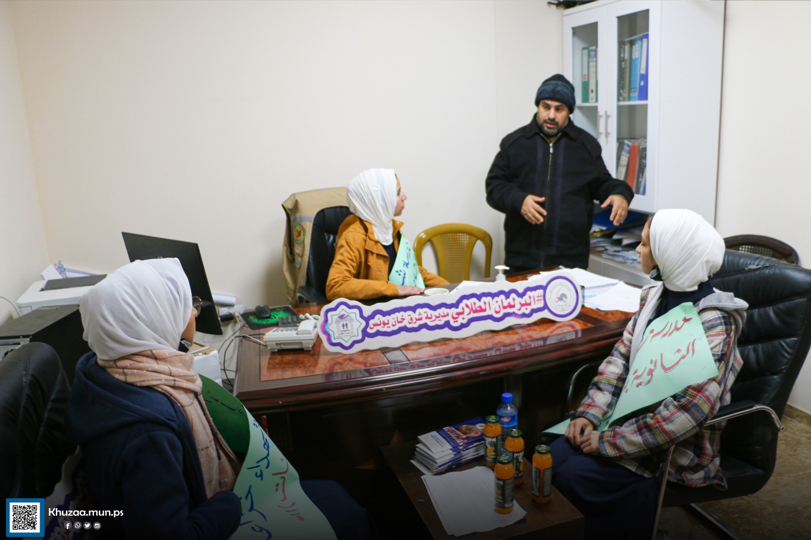 استقبل رئيس بلدية خزاعة م. عمر أبو ريدة بمكتبه البرلمان الطلابي لمدرسة شهداء خزاعة الثانوية – بنات بحضور أعضاء المجلس البلدي ،حيث تجول البرلمان في البلدية وتعرف على اقسامها ومهام موظفيها . تأتي هذه الزيارة لتعزيز التواصل والتعاون المستمر مع مؤسسات المجتمع