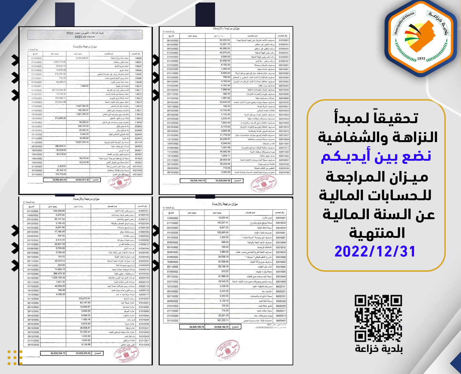 تحقيقا لمبدأ النزاهة والشفافية نقدم التقرير المالي لبلدية خزاعة للعام 2022